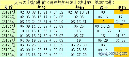 大乐透第25121期-第25130期前区奖号冷温热散播统计: